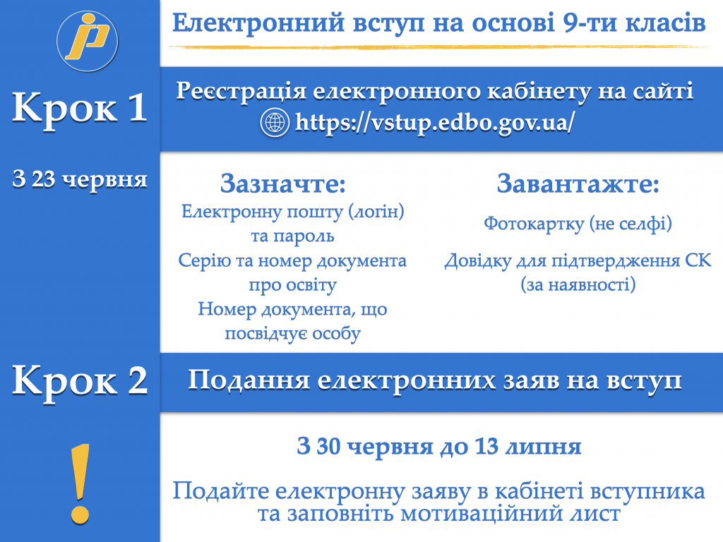 Цього року вступники на основі базової середньої освіти (тобто після завершення 9-го класу) вперше подаватимуть заяви через особисті електронні кабінети, реєстрація яких стартує 23 червня. Йдеться про тих, хто вступає на денну (дуальну) форму навчання на фахового молодшого бакалавра.