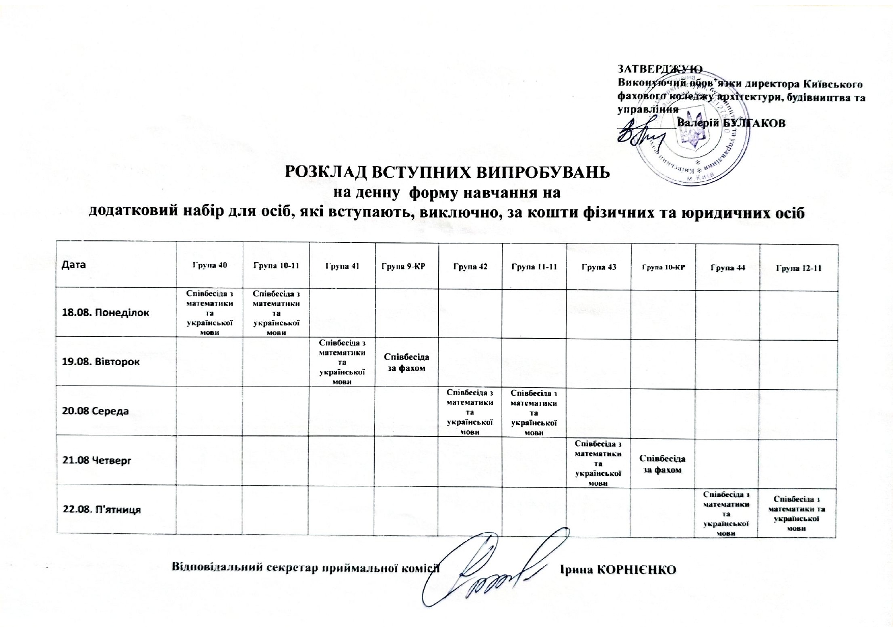 Розклад вступних випробувань (додатковий набір)