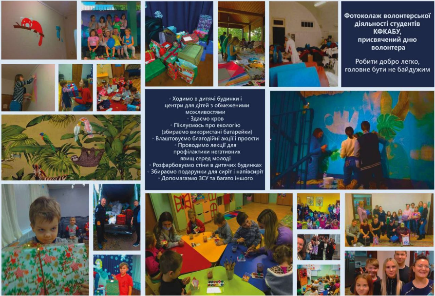 Ми хочемо жити в успішній країні, а країну визначають люди. Коли кожен небайдуже ставиться до свого оточення і вирішує проблеми, які турбують, країна розвивається. Ось чому сьогодні однією з підвалин громадянського суспільства є волонтерство. І саме участь у цьому благодійному русі набуває великого значення. Члени студентського самоврядування, студенти постійно надають допомогу дитячим будинкам, людям похилого віку, відвідують дітей з інвалідністю в спеціалізованих закладах. Сьогодні в умовах військового стану студенти працюють у волонтерських штабах, організовують посильні допомоги у тимчасово окуповані території. Разом з членами студентського самоврядування започаткували акцію «Смілива гривня» для збору коштів на потреби ЗСУ та організовуємо виготовлення окопних свічок для передачі у волонтерські штаби. Навіть одна добра справа здатна змінити суспільство, країну та світ на краще!